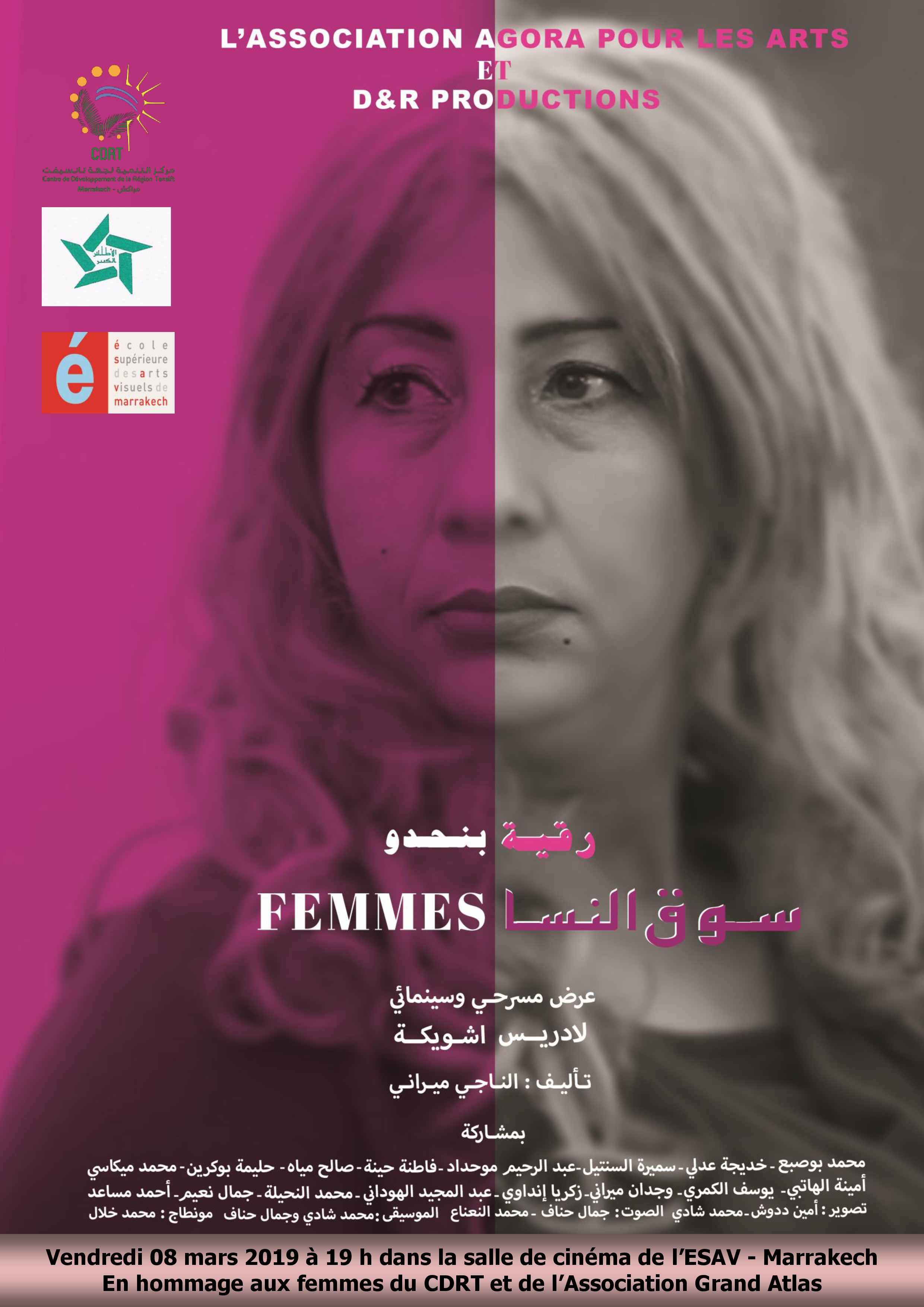 A l\’occasion de la célébration de la journée mondiale de la femme (2019) et en partenariat avec « l\’Association AGORA pour les arts » et D&R Productions , l\’Association du Grand Atlas et l\’Ecole Supérieure des Arts Visuels de Marrakech (ESAV), le Centre de Développement de la Région de Tensift (CDRT) présente un spectacle théâtral et cinématographique intitulé « Femmes »(SOUK N\’SA) du réalisateur/producteur Driss Chouika le vendredi 8 mars 2019 à l\’ESAV à 19h.